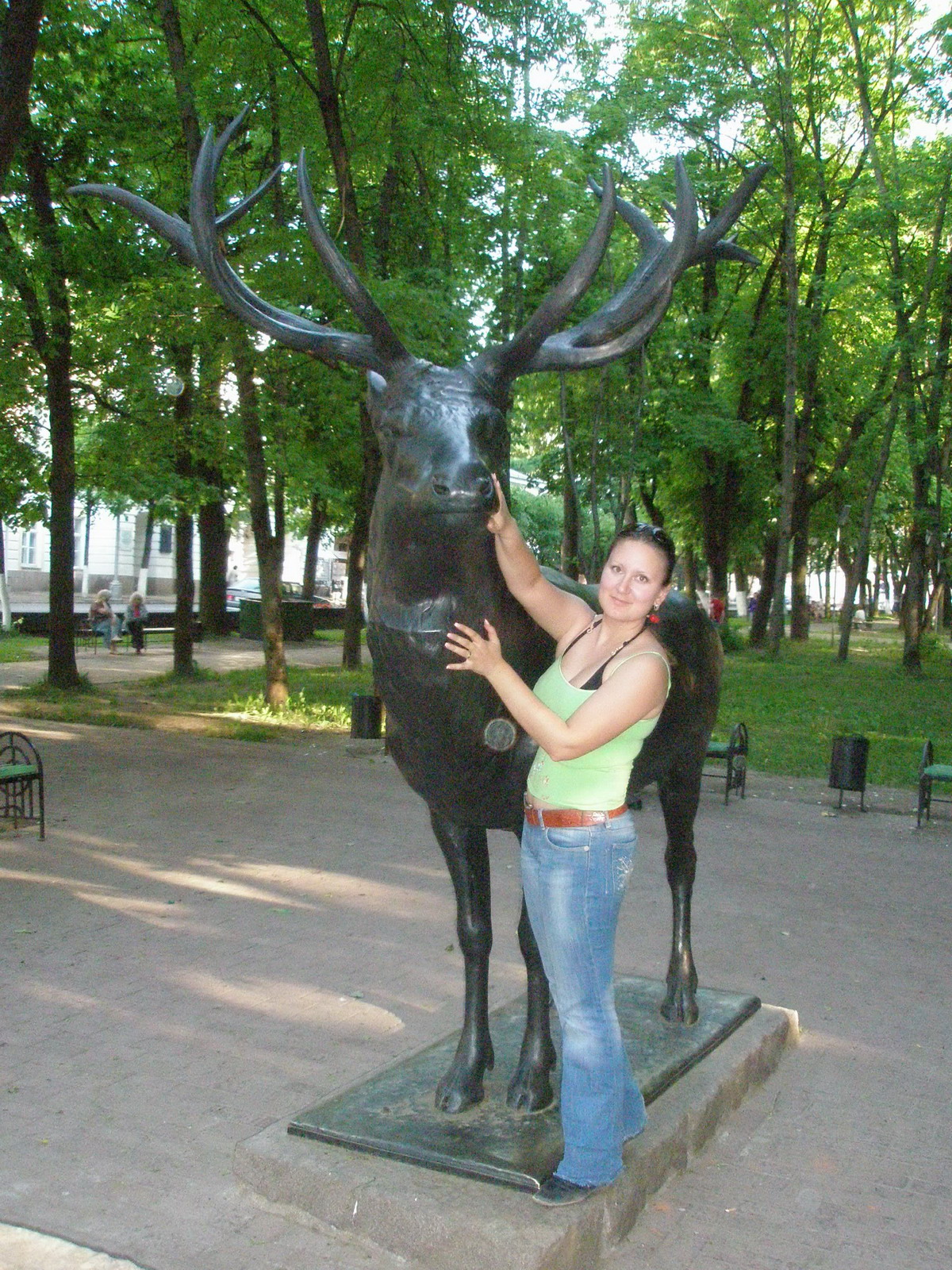 Время неумолимо шло вперёд, и пора было собираться в сторону Москвы...но так не хотелось уезжать...Смоленск и пригород просто очаровали меня...душа просила продолжения! Моё желание было удовлетворено! Мы отправились в парк, смотреть оленя! :mrgreen: Олень оказался металлическим...Однако это не просто олень, а очень важная достопримечательность! Нынче студенты суеверные, и об этом многие знают. Некоторые учащиеся, например, в Москве перед экзаменом (чтобы получить "зачет") натирают разные части некоторых памятников... :wink: Так вот этот олень - не исключение! В Смоленске студенту достаточно потереть...как бы это покультурнее сказать... :oops: семенные принадлежности...да, так трут, что это место (по рассказам) "сияет" за километр! "Сиять" им работники парка дают недолго - периодически красят! :mrgreen: