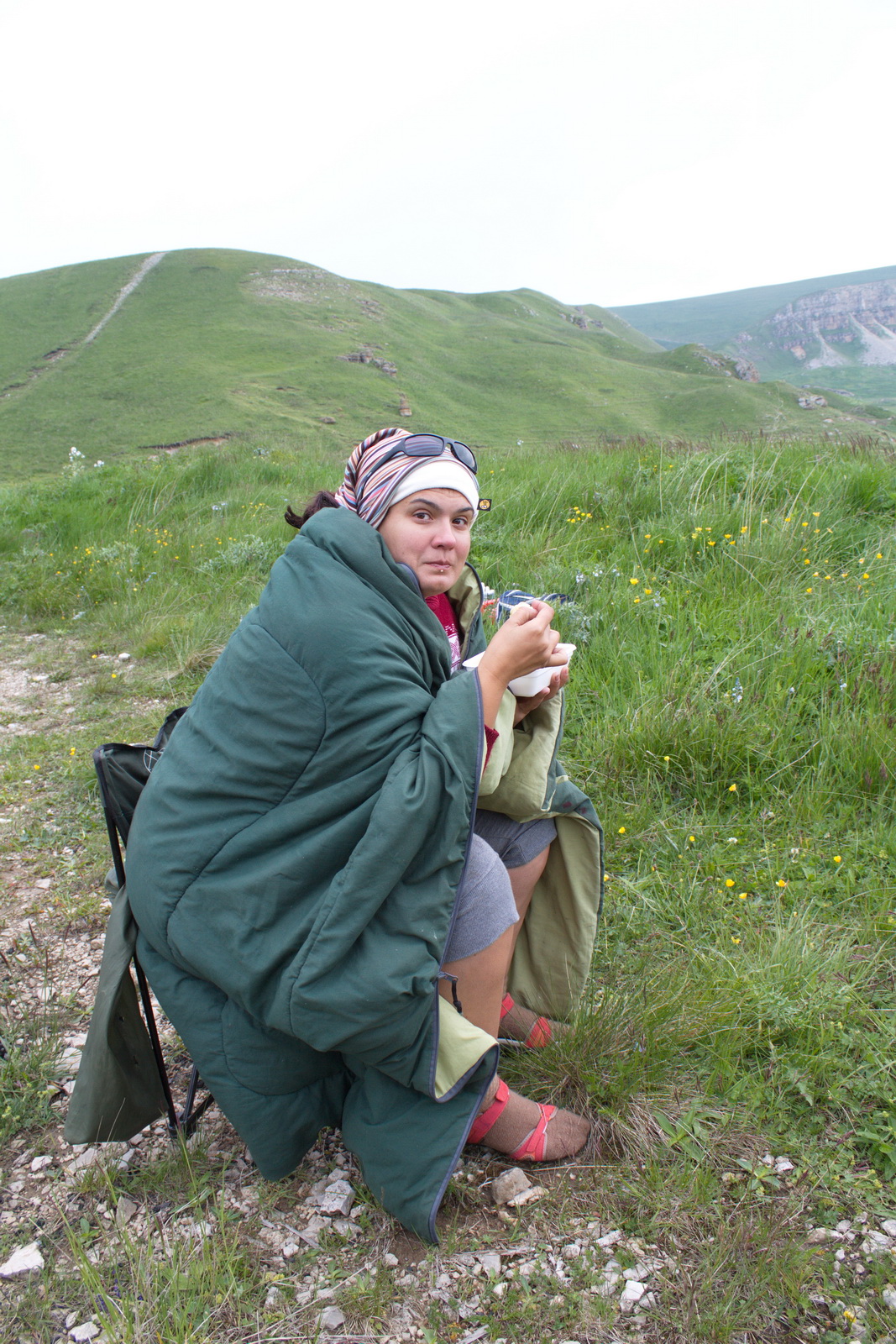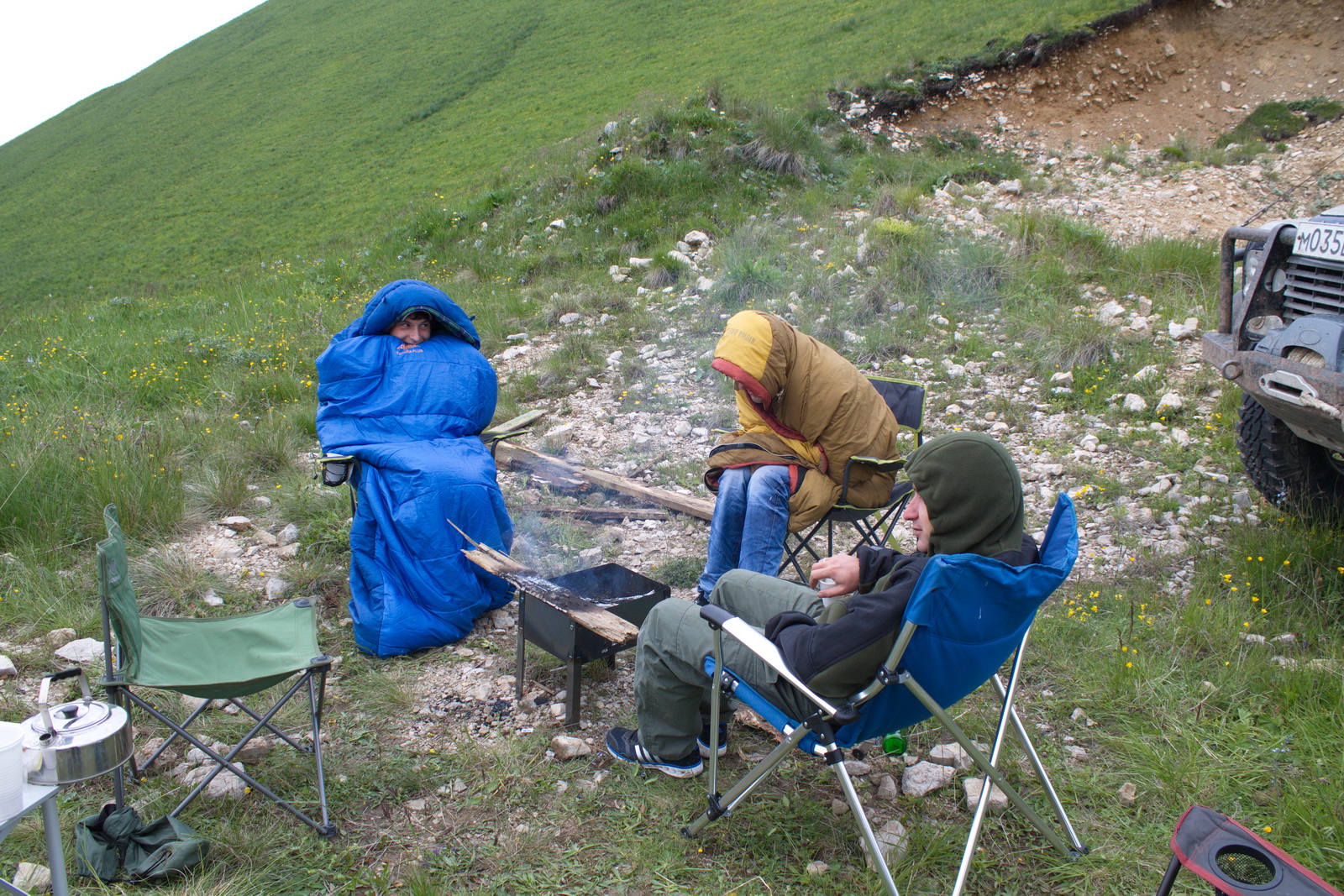 Утро казалось каким-то особенно холодным (я так думаю, для мальчиков, которые мёрзли вечером). Мне-то что будет в моём водопроводном костюме!? А им было зябко, потому несчастные ходили одетые в спальники. Надо добавить, что дров для костра тоже не взяли...удивительно, где находчивый мужчина Саня нашел их. С этим парнем точно не пропадёшь!