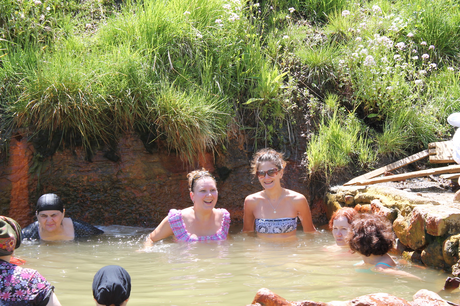 В Москве утро красит нежным светом стены древнего кремля, а у нас была своя картина! Ясное небо и вершина Эльбруса – вот такое утро! Пешие прогулки на вершину горы, чтобы увидеть больше – для тех, кто засиделся. С непривычки тяжеловато. Тут выяснилось, что мы ошиблись дорогой, когда ехали. То место, где мы должны были оказаться, находилось на соседней вершине горы! На развилке дорог свернули не на ту. Особо отважные члены нашей экспедиции готовы были рвануть буквально «напрямки» к Эльбрусу. Вот еле-еле удержали! Однако и в этом место, где мы остановились, тоже было интересно. Например, нарзан можно было набирать из любой скважины, коих там было не менее 5-ти. Для желающих оздоровиться не только изнутри, но и снаружи, наполнялась ванна под открытым небом. Строго в определенное время её принимали женщины, а в другое – мужчины. Вместе купаться строго запрещено. Не помню, но кто-то нам сказал, что вода в этой ванне тёплая. Так вот мы с Тру решили погреться…Температура на улице была всего +12. А вода оказалась холодной! Ну, мы уже разделись...пришлось лезть. Из дырки в скале с силой выходил газ. Ощущение от этого явления непередаваемые, но массаж получается прикольный. Газ выходит с такой силой, что буквально отпихивает от скалы.