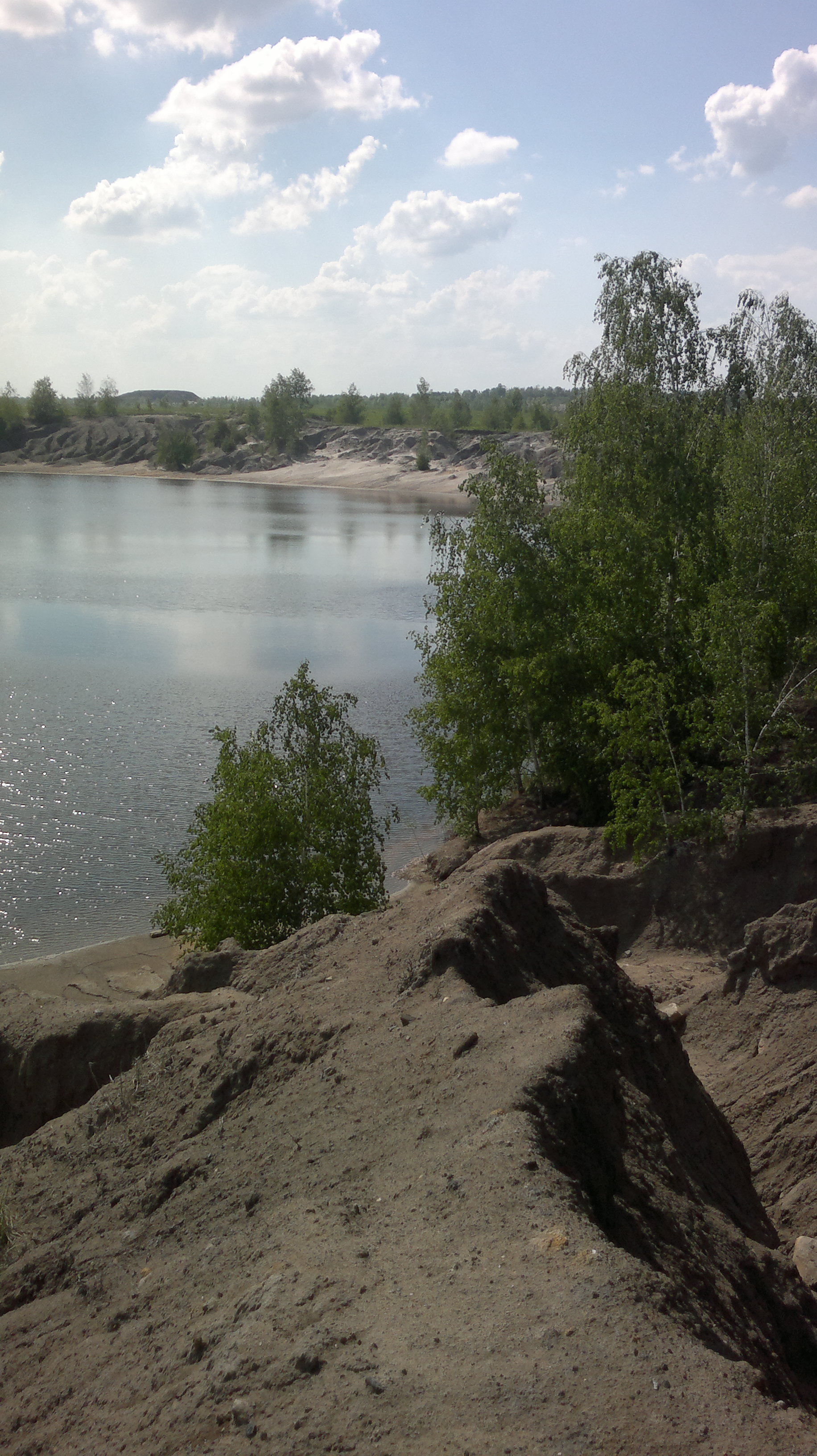 Горы-то мы видели издалека. Попрощавшись с вами и опросив местных жителей, мы поехали к карьерам. Изрезанные, вымытые осыпи, поросшие молодыми цветущими сосенками, очень красиво обрамляли карьерные озера. Но поскольку осыпи - это не горы все-таки, я посчитала, что мы их не нашли, да и времени слишком долго бродить не было. Но приехав домой и посмотрев геокешерское видео, поняла, что то, что виднелось на противоположном от нас берегу наверное уже не было осыпью...