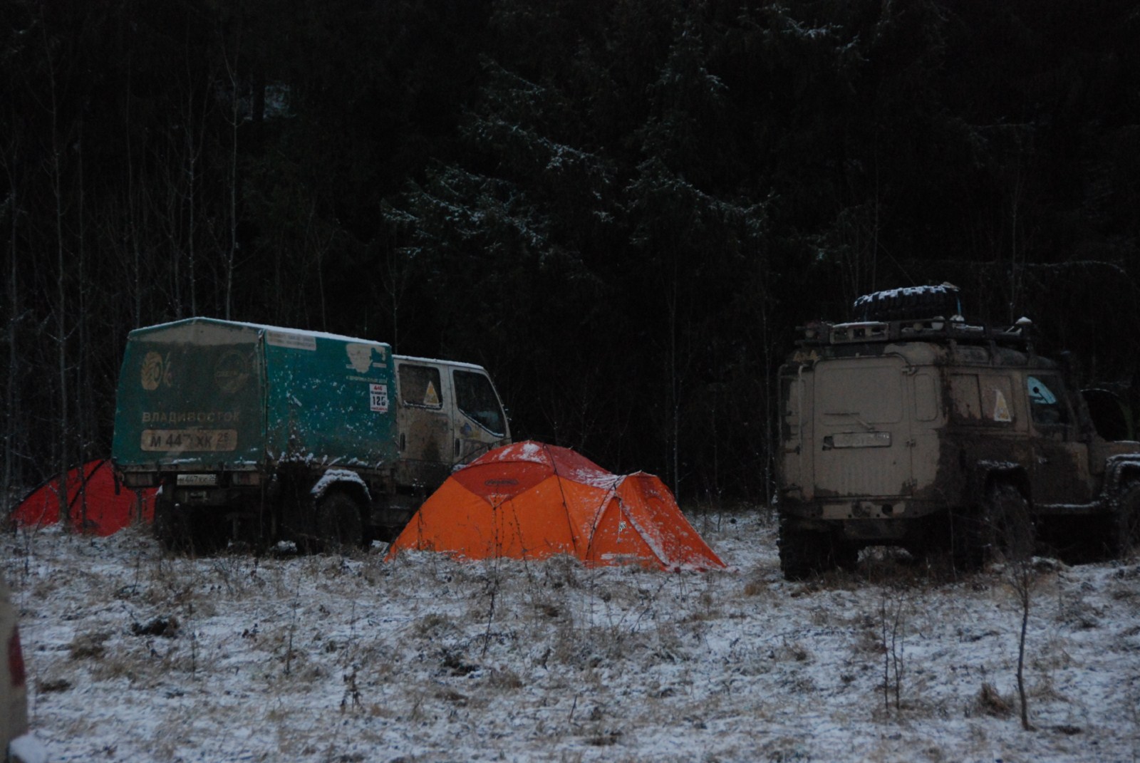 Из техники - на Дефе Пилота, скорее всего, срезана передняя полуось в редукторе, на Кантере по мелочам, но неприятно: постоянно пробивает камеры в колесах, окончательно умер барахливший до этого вакуумник и 4вд с понижайкой включать-выключать приходится отверткой на раздатке, чуть подогнута поперечная рулевая тяга (зато руль теперь встал прямо
