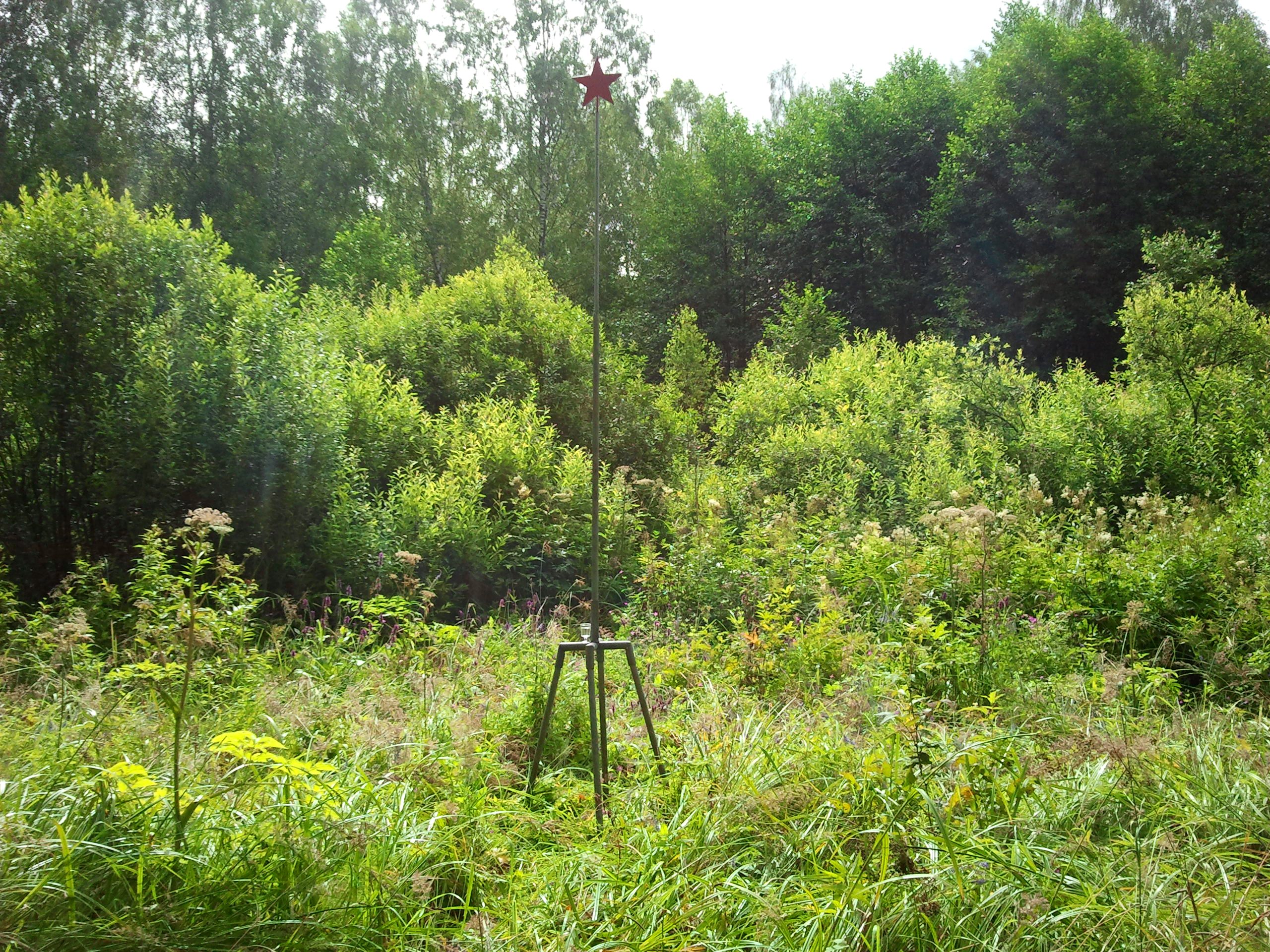Подойдя, как нам казалось, к месту кладбища, мы его не обнаружили. Один проводник пошел в одну сторону, другой – в другую, а мы остановились, чтобы Алексей, который нес рюкзак со снаряжением и сильно устал, передал его мне. Сначала мы перестали видеть своих проводников, а потом и слышать. По ходу движения, из разговоров, мы поняли, что поисковики не разглашают места воинских захоронений и других своих находок с целью не допустить к ним чужаков с непонятными намерениями. Именно поэтому, как мне кажется, я долго не мог получить координаты захоронения. Мы с Алексеем двинулись на Запад в нужном, как нам казалось направлении. Постепенно стали слышать отвечающие нам голоса и пошли на них. Вышли на поляну. Парни ждали нас на ней. Говорят, что пришли куда надо. Ерунда какая-то: место ничем не отличается от прочих. Вообще ничем. Точно такие же заросли, которых мы на протяжении нескольких километров пути видели уже немало... Тут Дмитрий протыкает сапог и накалывает ногу двумя гвоздями. Вот тебе, говорит, доказательство: это завалилась старая оградка кладбища, а вон там, машет рукой в сторону громадного кустарника, -памятник. Иди поищи. Я пошел искать, он со мной. Нашли пирамидку старого памятника. Так и есть: мы дошли. Звездочка отвалилась, кругом заросли кустов и травы. Печальная картина… Если бы парни с нами не пошли, мы бы ни за что не отыскали это место. Всякие оставшиеся сомнения улетучились. Спасибо им огромное. Достаем аптечку, обрабатываем Дмитрию рану.