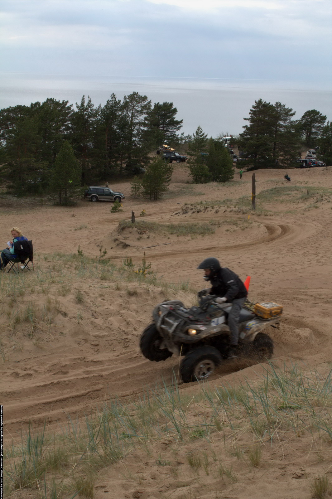 И это необычное случилось само сабой! На очередном вираже, Рома решил удивить народ и рванул по откосу песчаной горы! А нагоре в тот момент оказался мальчик, игравший в песке! За сердце схватилась добрая половина зрителей! Мальчик заметался и просто радостно, что не попал под колёса! Зрелище было...дух захватило! .........