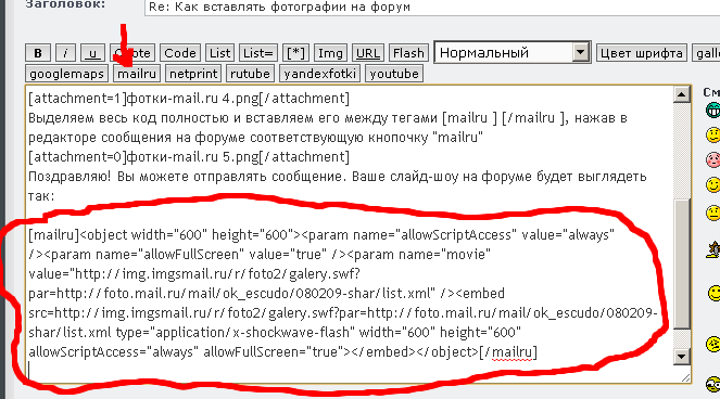 Если больше ничего не делать, то при отправке сообщения все фотографии будут размещены в порядке их закачки в конце, после текста сообщения. Если же поставить курсор в нужном месте текста и нажать на кнопку "Вставить в текст сообщения" (см. картинку выше) напротив нужной фотографии, то можно разместить фото на в конце, а в любом месте текста, где это логично по ходу повествования, как сделано вот в этом моем сообщении