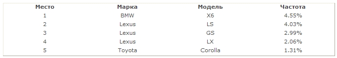 В Санкт-Петербурге по итогам первого полугодия 2010 года ТОП-5 самых угоняемых автомобилей: