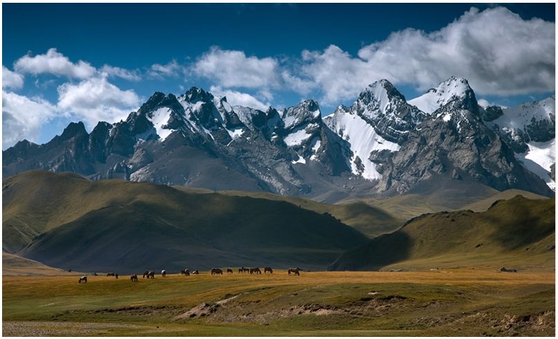 Плато Ассы – это летнее жайляу, расположенное на высоте более 2800 метров над уровнем моря. Зимой климат здесь очень суровый, но летом из-за обильных дождей, поливающих луга практический каждый день и горного палящего солнца, жайляу становится идеальным местом для выпаса домашнего скота. С древних времен этим благом природы умело пользуются чабаны. Их юрты отлично сочетаются с обширными лугами и горными хребтами, навевая атмосферу прошедших времен кочевников.