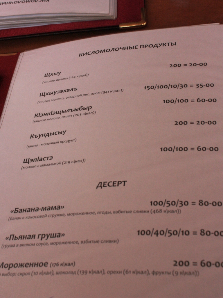 Чтение названий блюд в ресторане - занятие, которым гости себя занимают во время приготовления угощений вместо анекдотов. Когда мы спросили: "что это?", - официантка призналась, что не сможет это произнести.
