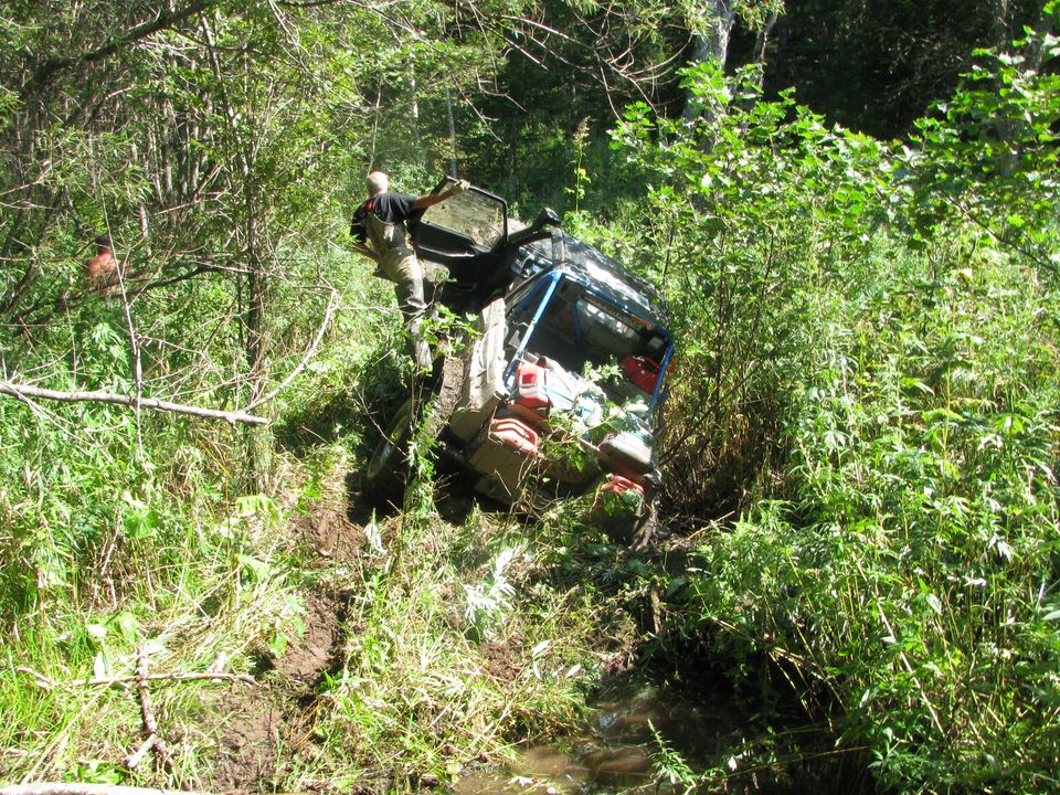 Испытали стресс - Кабан заглох в глубокой протоке, пришлось аврально цеплять его Дефом и тащить к берегу, со страхом вскрывать воздухан, проверять наличие воды во всех местах. Воды не обнаружили, попробовали провернуть - получается, стартером дернули - дергается, попробовали крутить - почихал и завелся, ура. Почему заглох - хто знат, бензинка мля... Дальше ему пришлось всю дорогу ехать с подмоченной … репутацией – сиденье не высушишь…