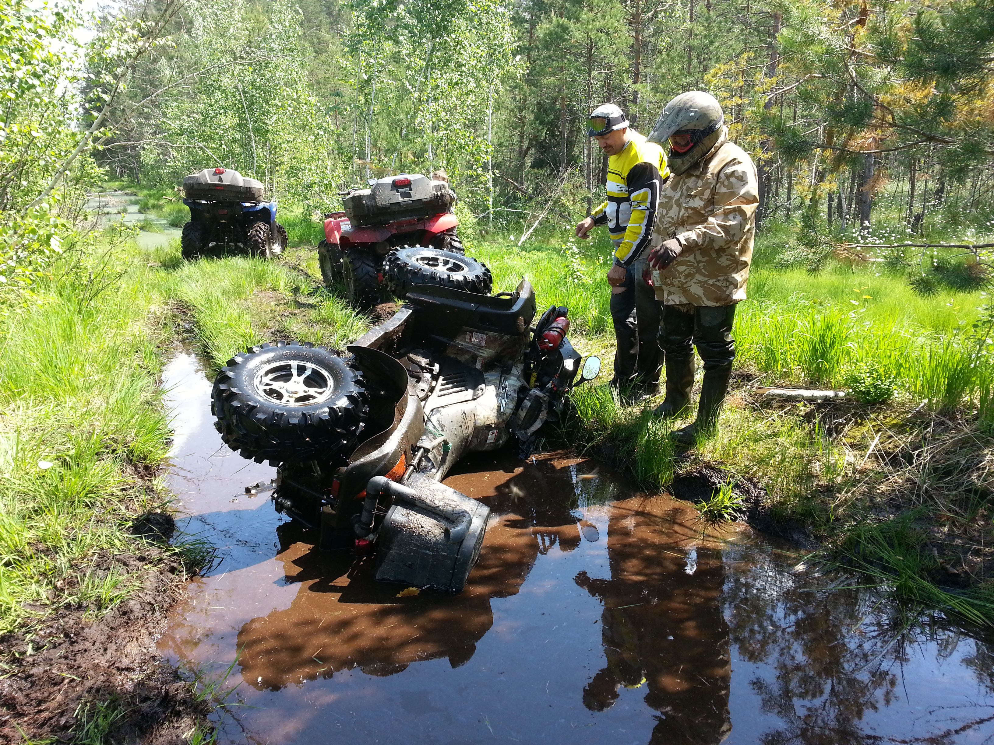 Первый раз проходили это место на трех квадрах весной. Намучились порядочно. В саму колею не полезли, после первых попыток стало ясно, что выгодней биться по обочинам, судя по следам эта мысль была не нова. Но обочины представляли из себя ковровое болото, поросшее лесом с одной стороны и просто болото без леса с другой. Кое как пробились на лебедке через лес. Место нам очень запомнилось, такой локальный адский участок даже для квадра.
